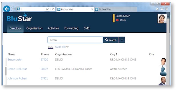 Andra funktioner i Blustar Web är intuitiv katalogsökning, inkluderad fonetisk sökning, Den ger detaljerad närvaroinformation och har stöd för flera webbplatser och autentiseringsprotokoll, vilket gör det möjligt att ge samma service till interna och externa användare.