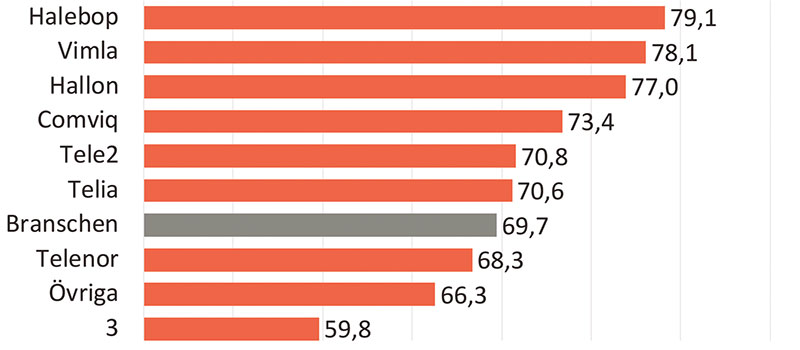 Nöjdare än någonsin. När SKI i år studerade mobiloperatörerna och hur nöjda deras kunder var framgår det att svenska folket är riktigt nöjda. Intressant är även att årets ökning främst har drivits av de mindre varumärkena där Vimla och Halebop ökar mest. Bland privatpersoner var det just sistnämnda som toppade rankingen följt av Vimla, Hallon och Comviq. När det gäller företagskunder var det återigen Telia som hamnade i topp.