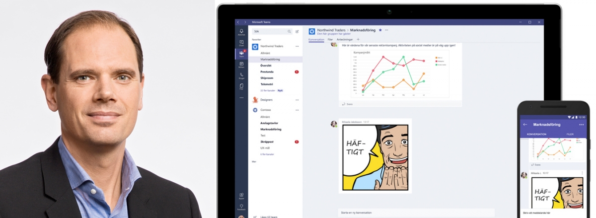 – Teams har fått ett enormt mottagande under sitt första år och den utvecklas hela tiden. Men kundernas första reaktion är ofta ”wow, det här hade jag inte förstått”. När folk ser hur snabbt och smidigt man får ihop chatt-tjänsten med mötes- och samarbetsdelen samt appar – då inser de vilken kompetent plattform det är.