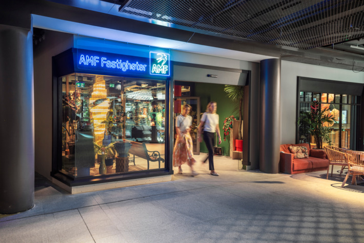 Bland butiker, kaféer och ivrigt spatserande fotgängare finns AMF Fastigheters nya kontor. Entrén ger med sin skarpa blå neonlogotyp ett lika öppet och välkomnande intryck som de omkringliggande etablissemangen.