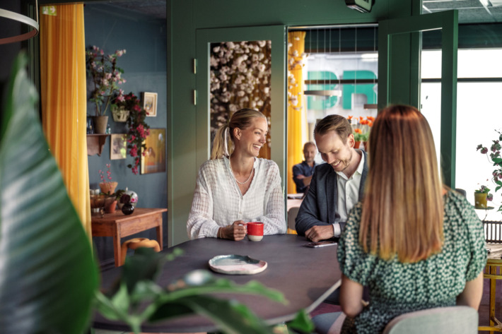 – Vi vill att vår öppna, externa yta på kontoret ska fungera lite som ett café. Man kan bestämma träff här, men också stöta på någon av en slump och inleda ett samtal som leder till nya samarbeten. Slumpmässiga möten förekom knappast på vårt förra kontor, säger Mossfeldt.