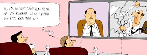 – Det har hunnit bli ganska många så det måste jag få fundera på. (Niklas återkom senare med ett svar. Strippen om kollegorna som njuter av en trasslande videokonferens här ovanför hör till hans absoluta favoriter. Den publicerades redan i nummer 7 2009.)