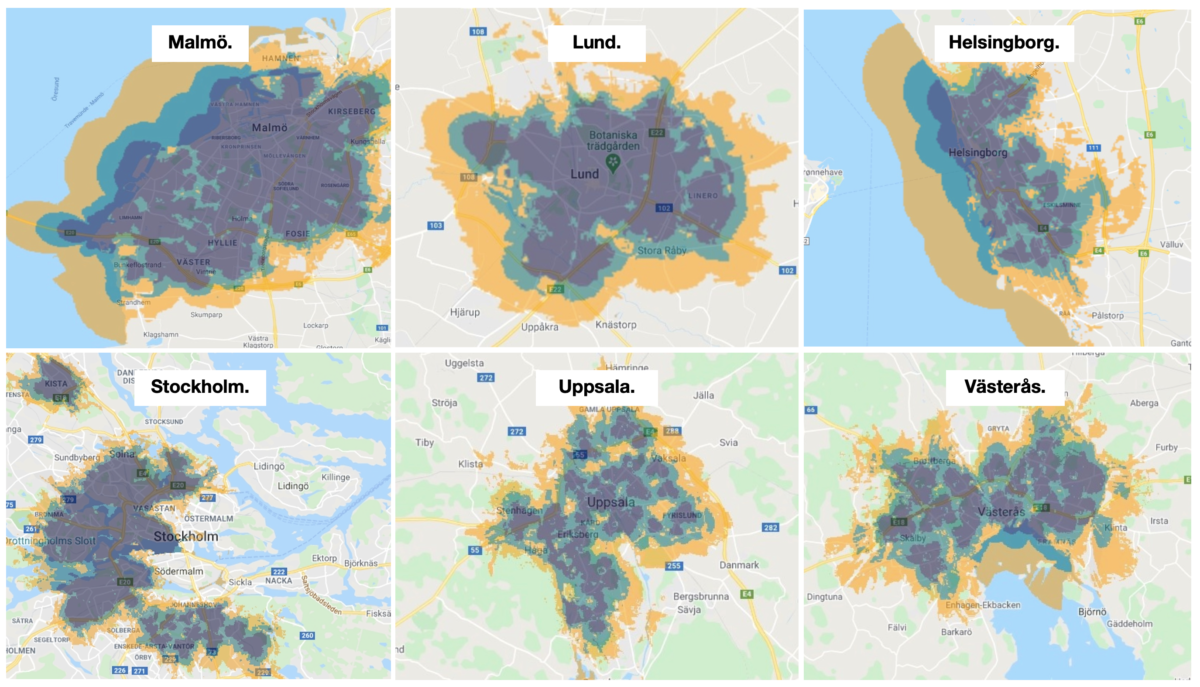 17 juni får framför allt centrala delar av Malmö och Lund tillgång till 5g. Fem dagar senare tillkommer Uppsala, Helsingborg, Västerås och ytterligare några delar av Stockholm så som Kungsholmen, Kista, Bagarmossen och Bromma. I dag har Tre 385 5g-master, varav 200 i Stockholm.